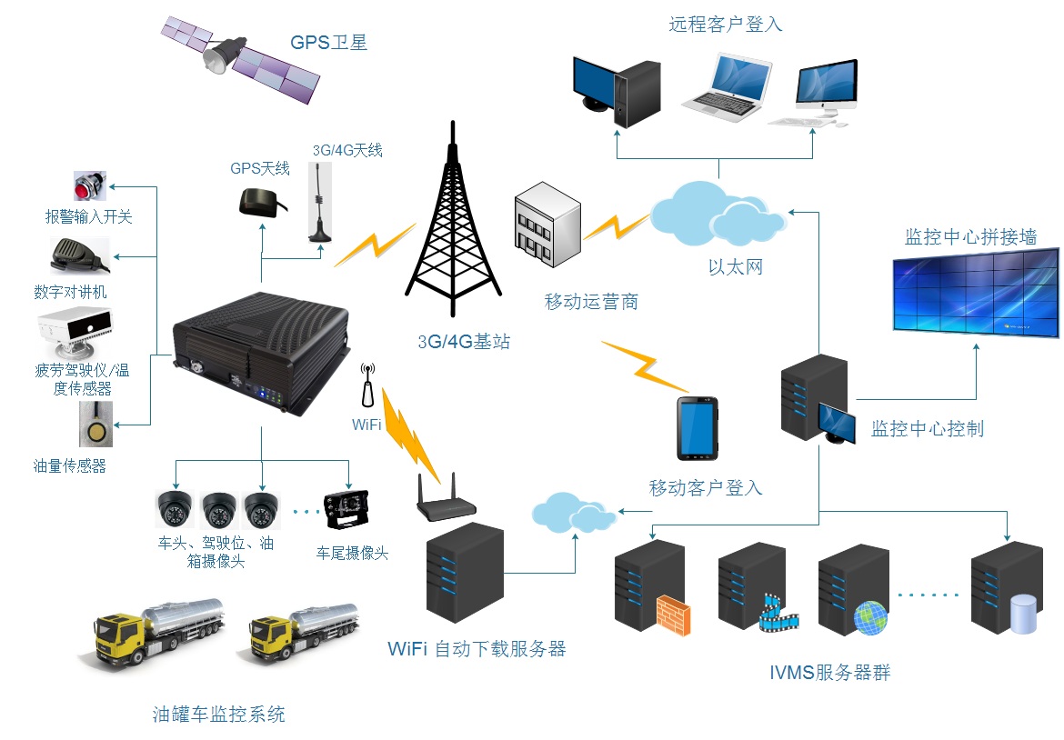 前端車載監控系統是整個方案的重要組成部分,它是通過在車內外安裝攝像頭采集音視頻數據,實現安全無死角監控;并利用GPS全球衛星定位系統實現對車輛進行實時定位;同時外接車載報警開關,可實現相應的報警提示(如:報警按鈕、剎車、門磁開關等);配置數字對講機后可實現平臺與單輛/多輛之間的對講;配備疲勞駕駛儀可監控司機的疲勞狀態,預防交通意外;并通過車載MDVR主機對音視頻、GPS、報警數據進行編碼、存儲及3G/4G無線網絡上報服務器,從而實現對車輛的遠程監控與管理。